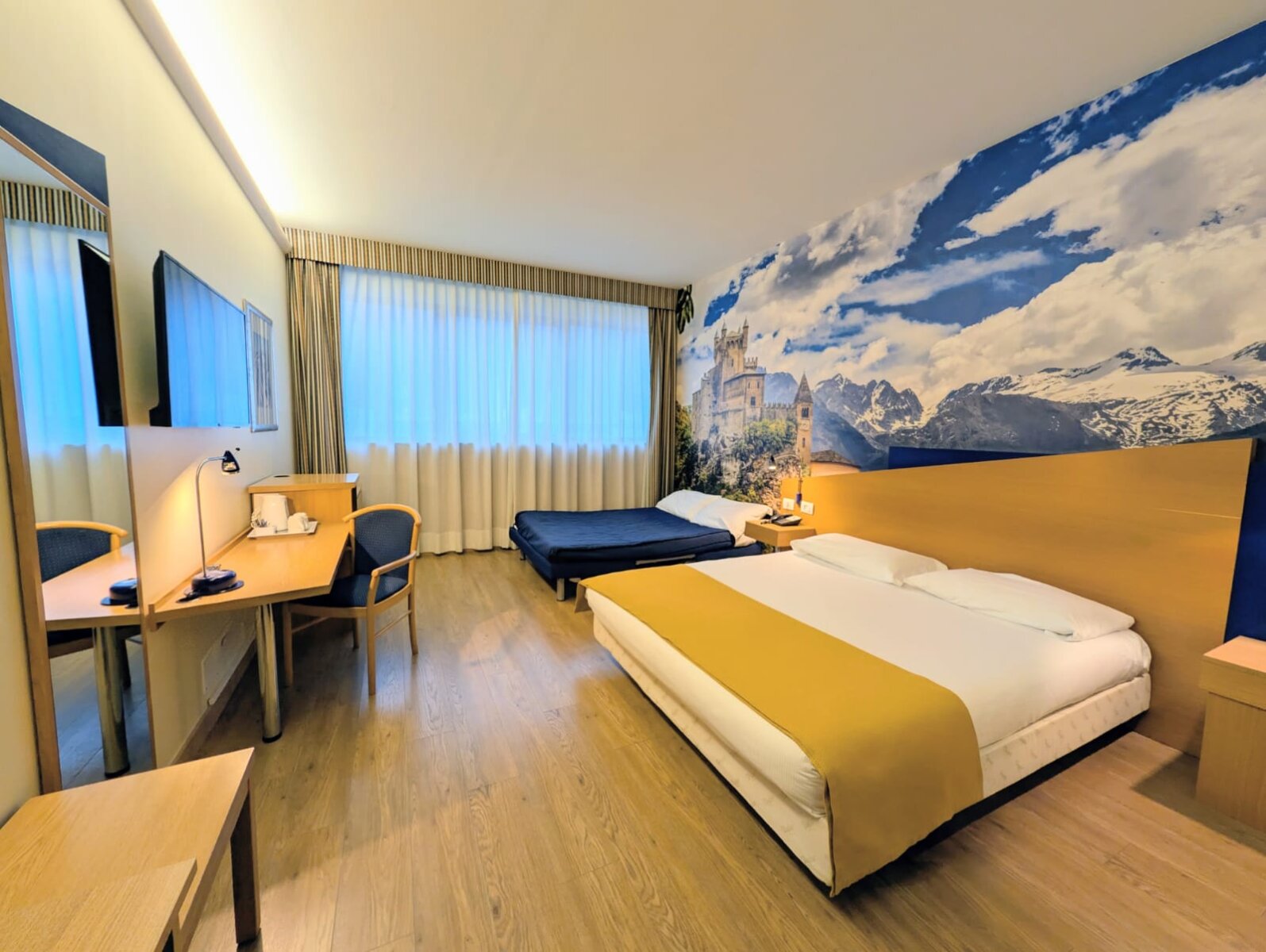 Recently renovated, the rooms on the 2nd floor feature unique decor with stunning wall-sized images of the majestic mountains or castles of the Aosta Valley, creating a captivating atmosphere.