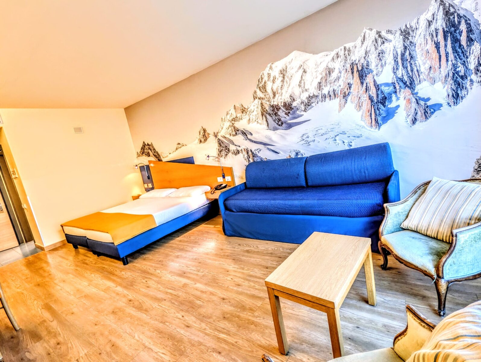 Nos chambres Deluxe, récemment rénovées, se trouvent au 2e étage et disposent d’un mur décoré d’une impressionnante gigantographie des montagnes ou des châteaux de la vallée d’Aoste. Elles offrent un confort maximal grâce à un vaste espace de séjour, aménagé avec un canapé confortable et deux fauteuils, idéaux pour se détendre après une journée d’exploration ou de travail.
